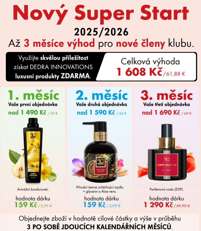 3-mesačný darčekový program SUPER START – každý nový zákazník sa môže tešiť na špeciálne darčeky a výhody. Stačí prvoobjednávka nad 59 € (zapojenie do programu nie je povinné).